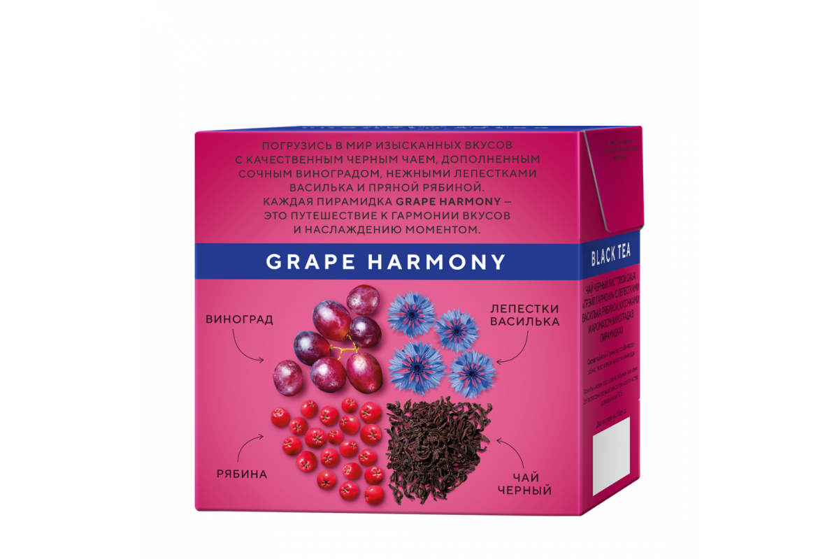 Погрузись в мир изысканных вкусов с качественным черным чаем, дополненным сочным виноградом, нежными лепестками василька и пряной рябиной.