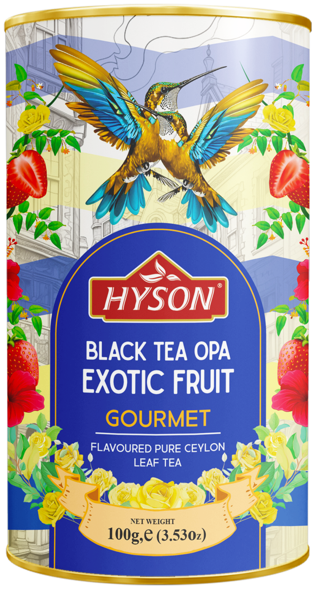 Чай «HYSON» Экзотические фрукты имеет насыщенный вкус тропических плодов. Смесь черного чая и натуральных добавок, таких как шиповник, клубника и гибискус, создаёт гармоничный баланс сладких и свежих нот. Напиток обладает приятной фруктовой кислинкой и легким ароматом. Отличный выбор для любителей чая с необычным вкусом.