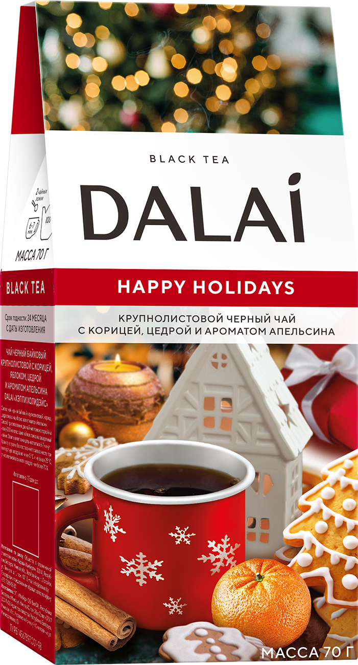 Новый год пахнет ёлкой, мандаринами, счастьем и мечтами. Продлите праздник с чаем DALAI HAPPY HOLIDAYS. Крупнолистовой чёрный цейлонский чай в сочетании с согревающей корицей, свежестью яблока, цедрой апельсина и ароматом мандарина создаст уютную Новогоднюю атмосферу.